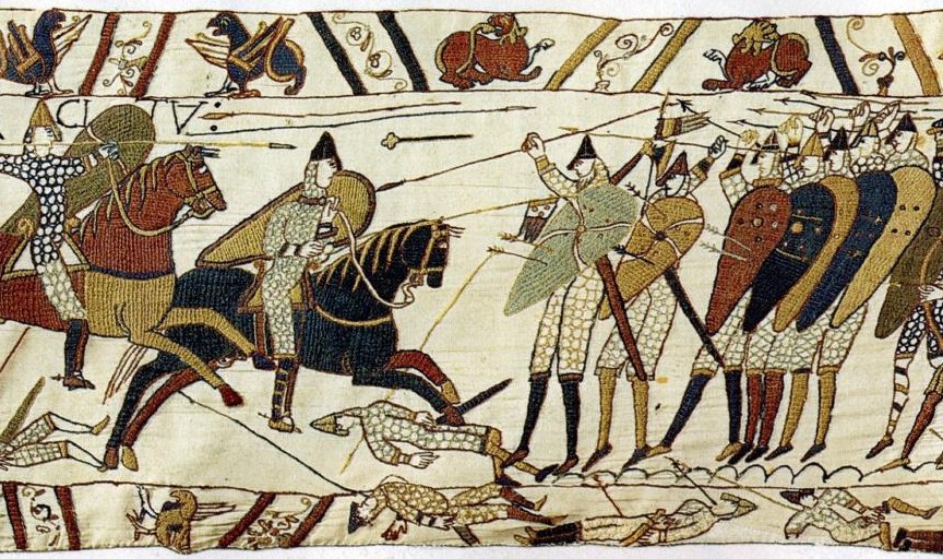 - Bayeux Tapestry section showing Norman horses charging English foot-soldiers in a shieldwall: Silvia Calderon via Flickr (CC BY-NC-ND 2.0)